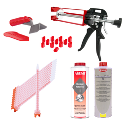 Akemi PACK PROMO pour coller et finir les joints en onglet 45° Comprend : 1x Nettoyant préliminaire I ; 1x Nettoyant avant durcissement P 1x Pistolet Colour Bond pour cartouches 250 ml 12x Tête de mélange 12x Jollynator Mixing Nozzle - accessoire pour tête de mélange pour coupes en 45° 1x ; Jollynator - outil de lissage + spatule de nettoyage |